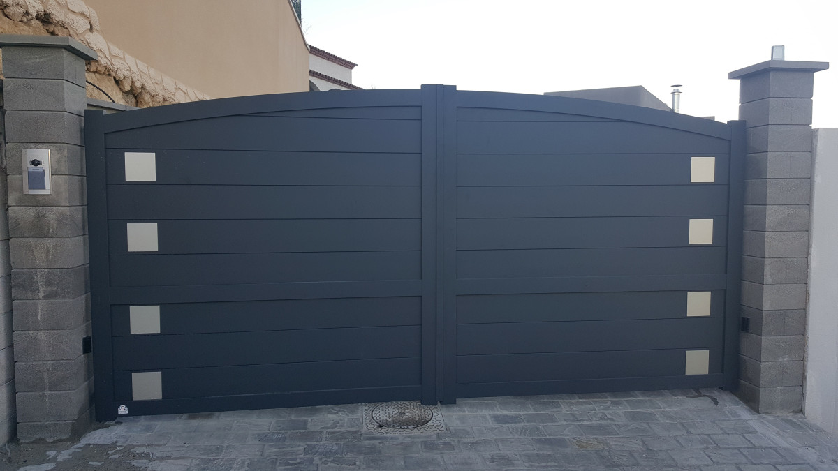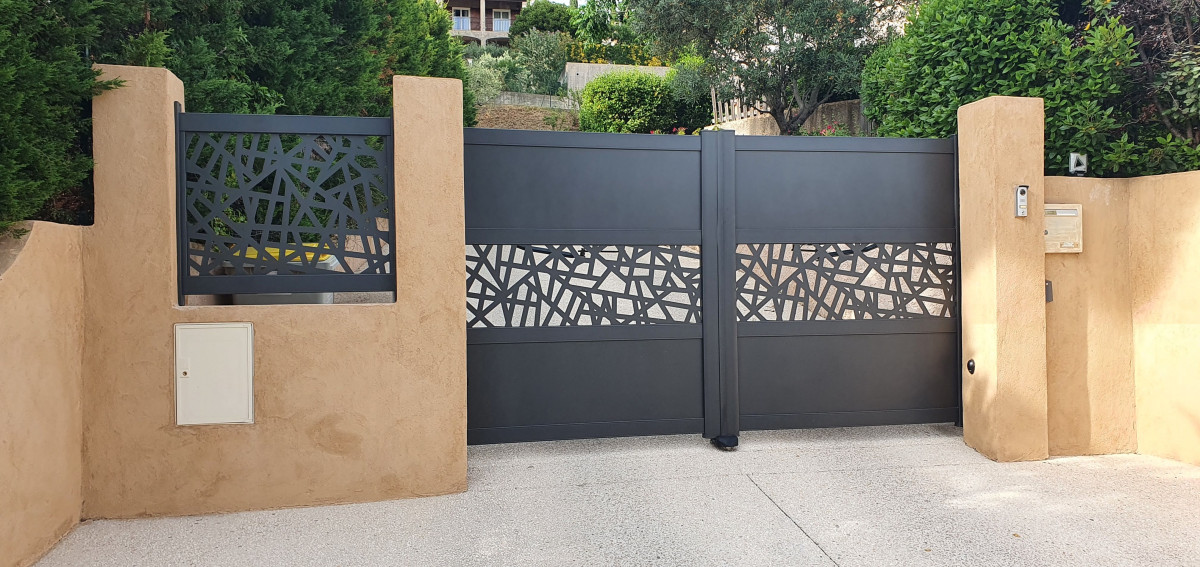 - Portails en Aluminium à façon. Nous faisons fabriquer votre portail à la façon d'un ferronnier, éventuellement avec des volutes et décors pouvant être intégrés entre ou dans les barreaux, intégration de découpes laser (initiales, armoiries, décors), nous étudions toute demande de réalisation. Tous nos portails en aluminium sont entièrement soudés et livrés thermolaqués à la couleur RAL de votre choix. Nous avons également la possibilité de faire thermolaquer votre portail dans des couleurs spéciales (Couleur Rouille, textures structurées,...) afin de faire démarquer au mieux l'aspect de votre entrée.
